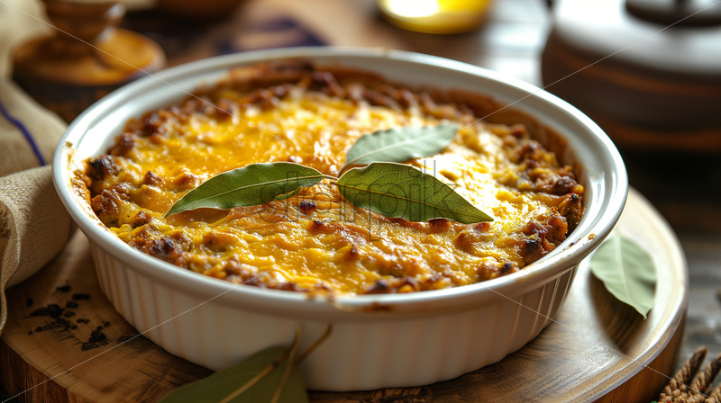 Baked spiced minced meat dish with a golden-brown crust, served in a casserole dish and garnished with bay leaves.