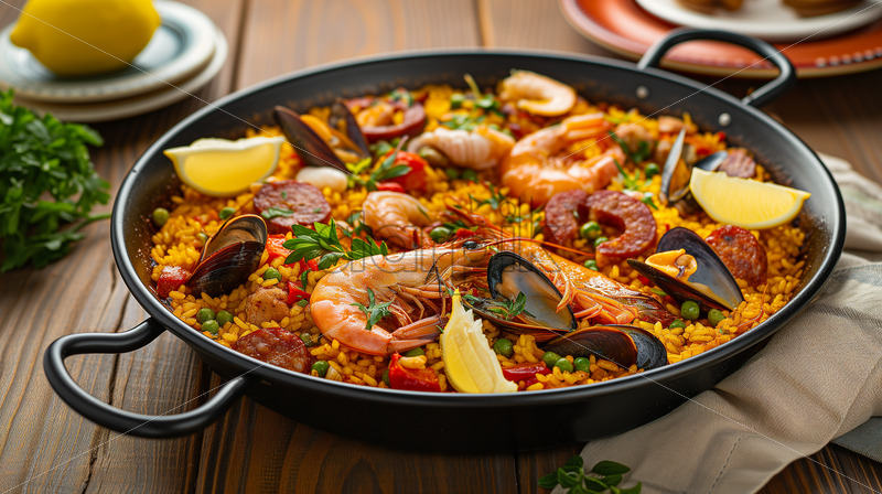 An elegant photograph showcasing Spanish Paella, a flavorful rice dish with saffron-infused broth, seafood, and chorizo.