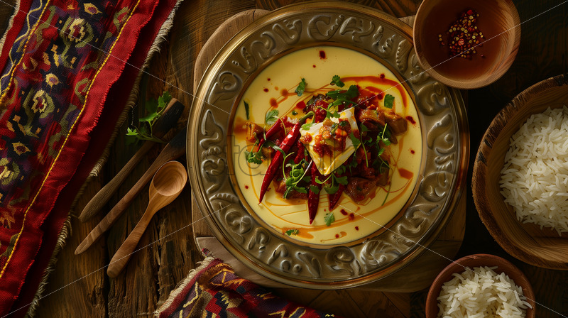 Bhutanese Ema Datshi, a spicy dish made with chili peppers and cheese, often served with rice.