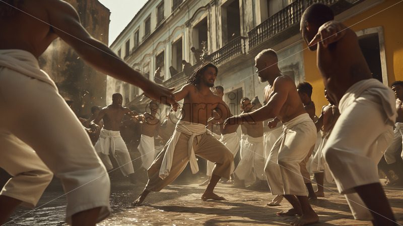 A group of Capoeira practitioners engages in a spirited roda, their bodies moving with agility and grace as they blend martial arts and dance. Their faces reflect determination and camaraderie, embodying the unity of Capoeira culture.