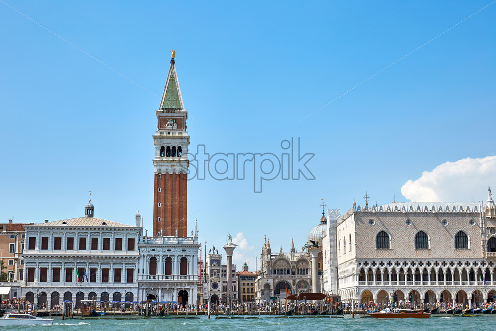 Home » Shop » photo » St. Mark’s Square from canal view. Renaissance style bell tower and boats in front. Venice, Italy