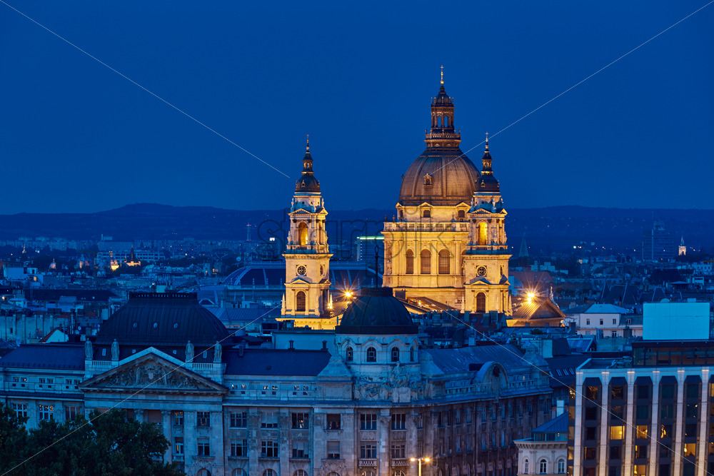 St. Stephen’s Basilica at night blue hour. Illuminated with yellow light. Telephoto view. Budapest, Hungary