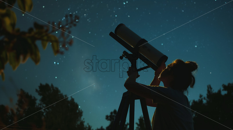 A person gazing at the stars through a telescope in a backyard, surrounded by the quiet beauty of the night sky.