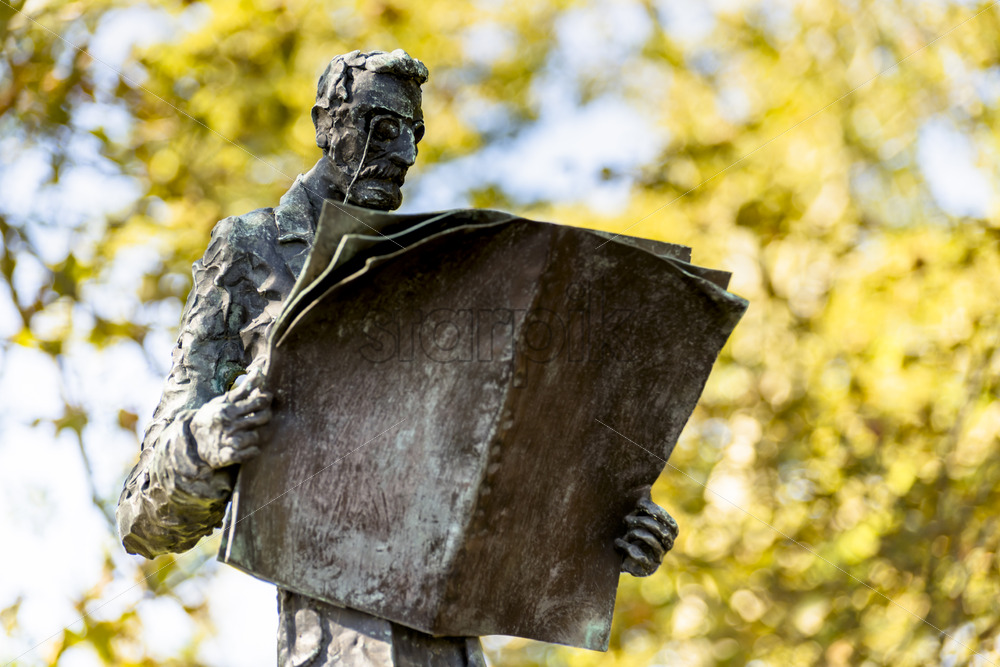 Close rear view of a statue of a man with book on Liberty Island, New York, USA. Trees on the background