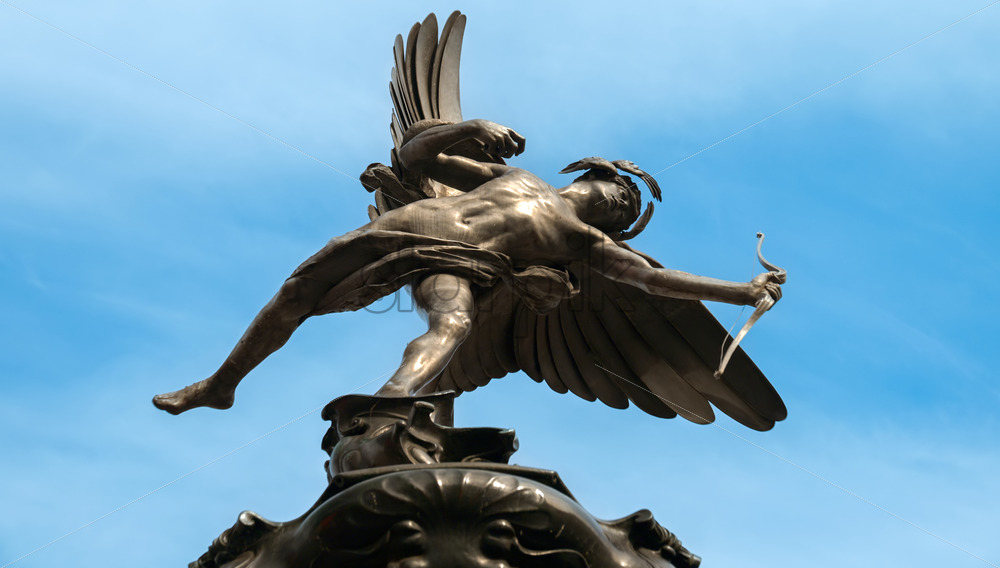 Statue on top of the Shaftesbury Memorial Fountain at Piccadilly Circus in London downtown, United Kingdom