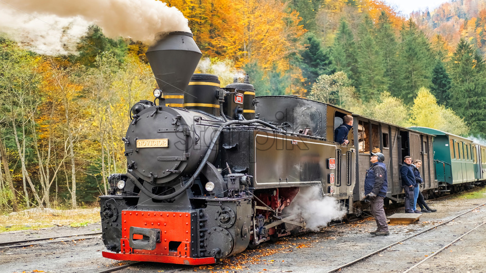 VISEU DE SUS, ROMANIA – OCTOBER 29, 2021: View of the steam train Mocanita in a valley on a railway station, workers, lush forest around