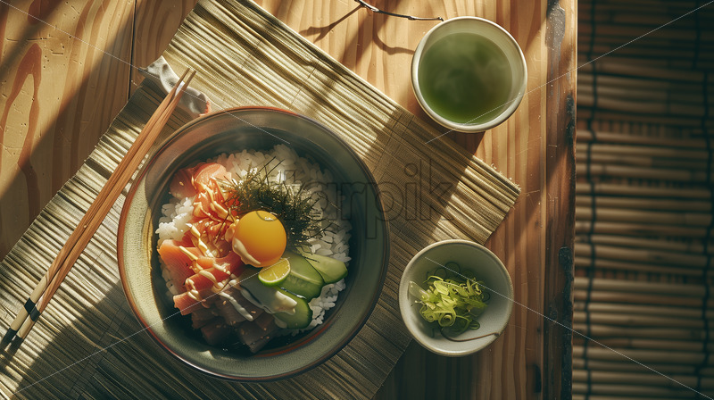 A bowl of donburi accompanied by a side dish of pickled vegetables and a small cup of green tea.