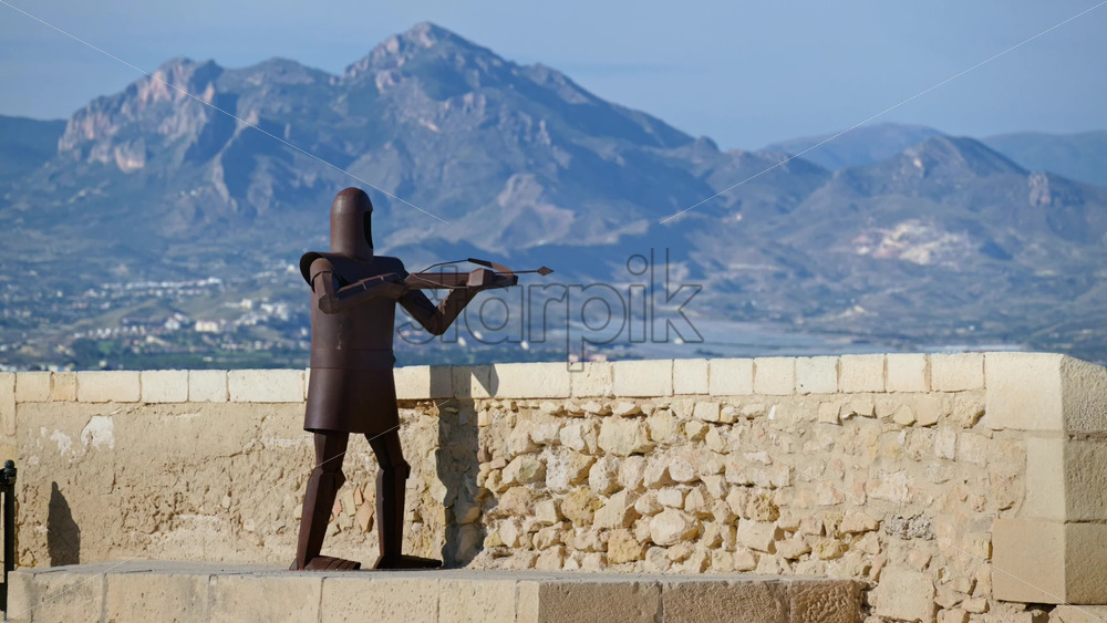 Steel sculpture of a medieval crossbowman on the Santa Barbara Castle parapet, city and mountains on the background Royalty Free Stock Video Footage