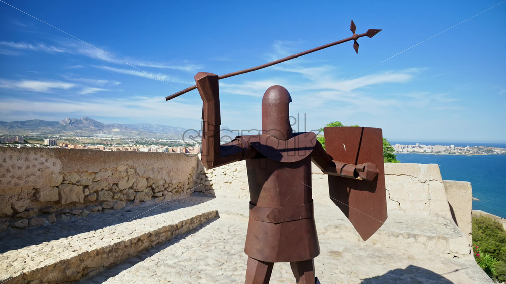 Steel sculpture of a medieval crossbowman on the Santa Barbara Castle parapet, city and mountains on the background Royalty Free Stock Video Footage