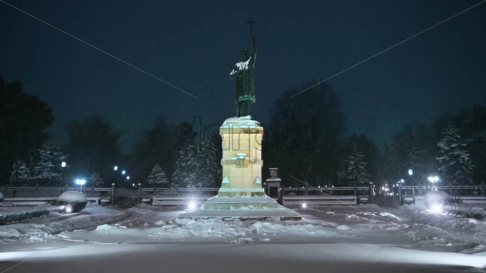 Stephen the Great monument during a snowfall. Blue hour. Winter evening in Chisinau, Moldova Royalty Free Stock Video Footage