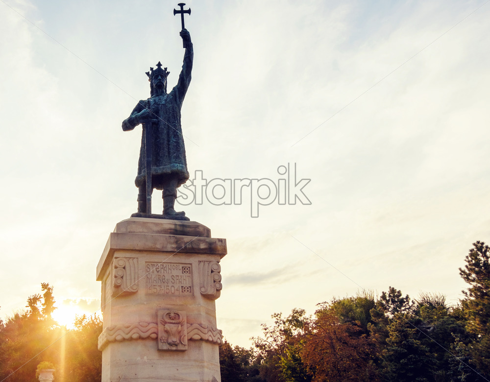 Stephen the Great Monument in the city center, against the background of the sunset, Chisinau, Moldova