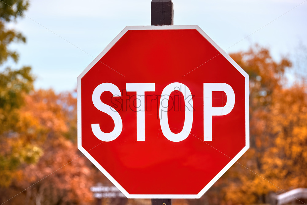 Home » Shop » photo » Stop sign with yellowed trees on the background in Massachusetts, USA