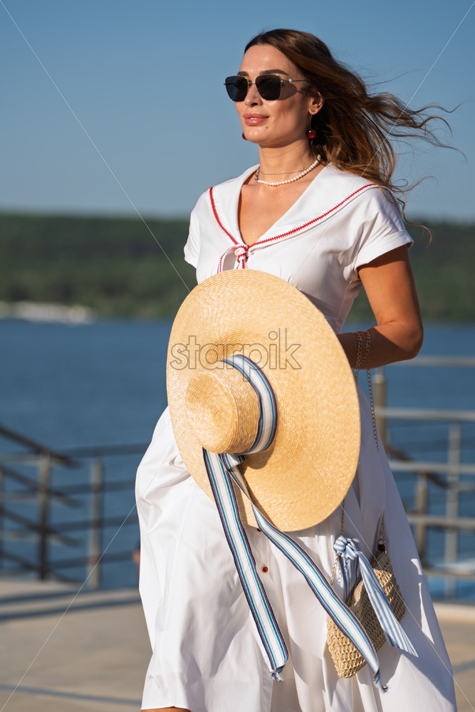 Chisinau, Moldova – June 17, 2025: Woman holding a wide-brimmed straw hat with a ribbon, soaking in the late afternoon light Royalty Free Stock Video Footage
