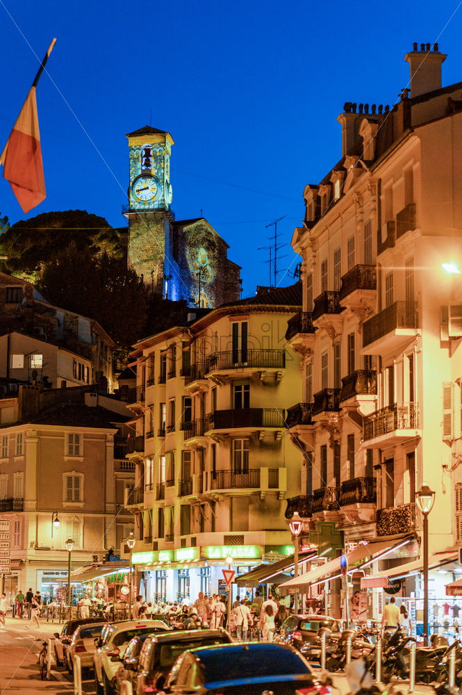 CANNES, FRANCE – AUGUST 31, 2021: Street scape of the town at night. Traditional buildings, people, nightlights, Eglise Notre Dame Esperance on the hill