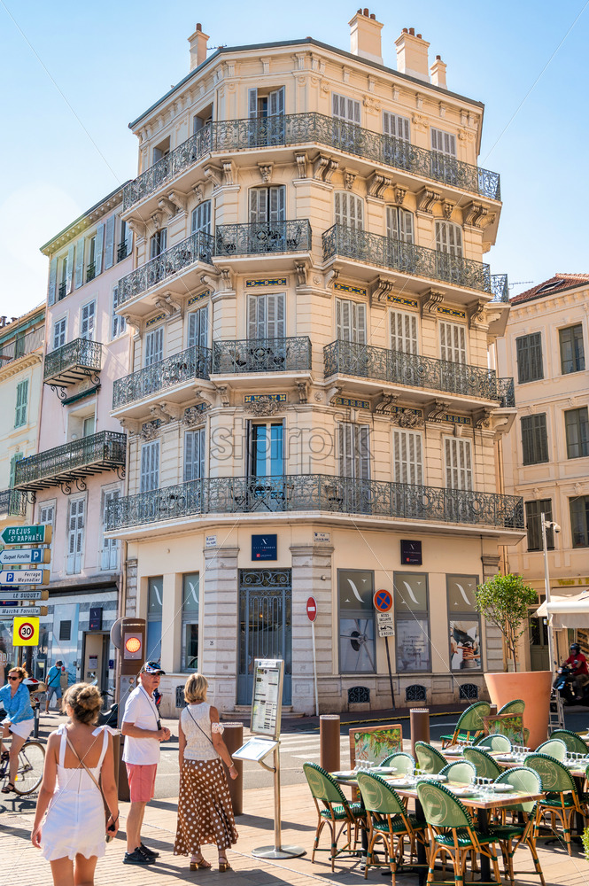 CANNES, FRANCE – AUGUST 31, 2021: Street scape of the town. Traditional buildings, people, sunny day