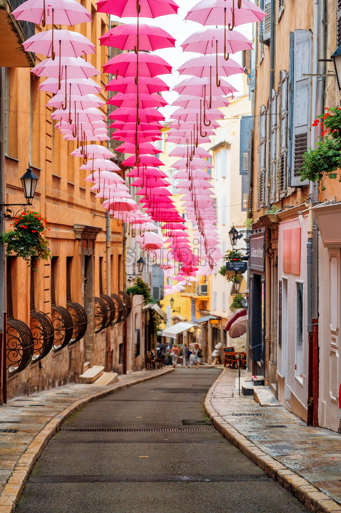 Street scape of Grasse, France. Narrow street with rows of pink umbrellas