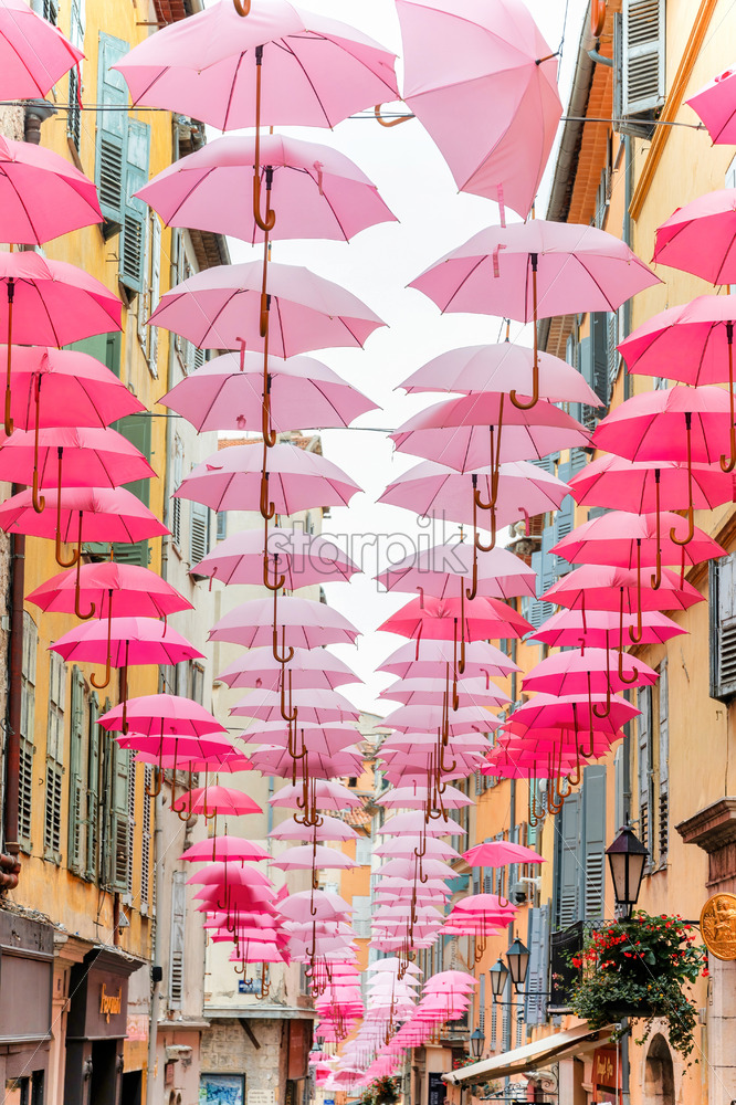GRASSE, FRANCE – SEPTEMBER 3, 2021: Street scape of the town. Narrow street with rows of pink umbrellas