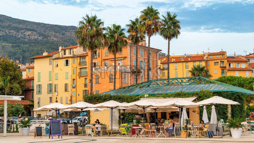 MENTON, FRANCE – SEPTEMBER 8, 2021: Street scape of the town. Traditional buildings, embankment street with people and cafes, greenery