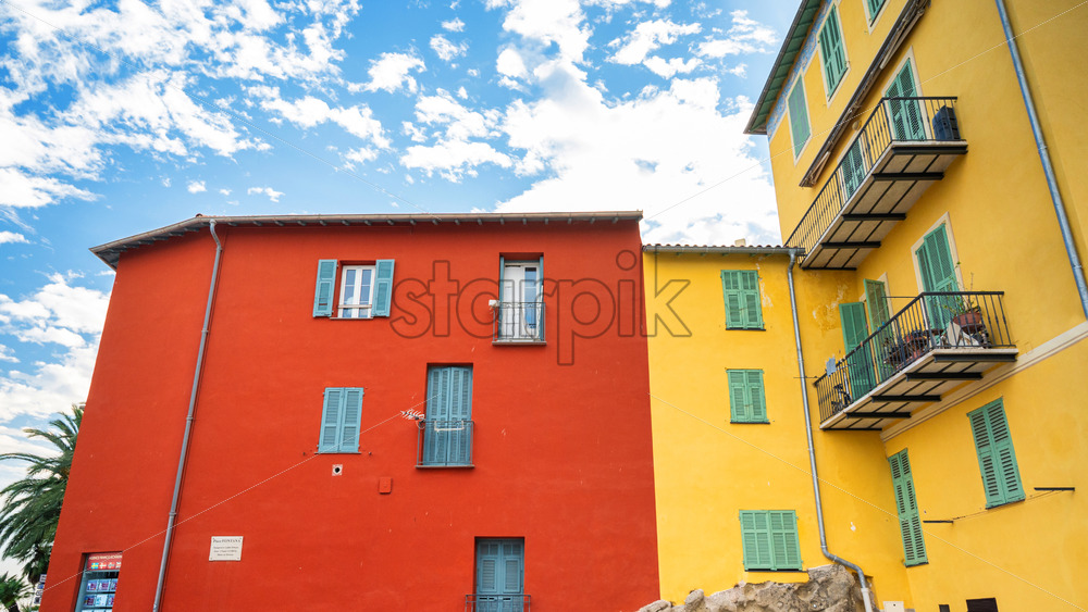Street scape of Menton, France. Traditional residential buildings with colored facades