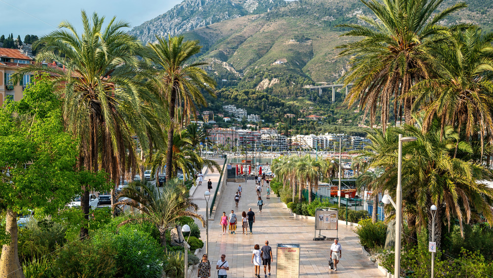 MENTON, FRANCE – SEPTEMBER 5, 2021: Street scape of the town. Embankment street, a lot of greenery, a lot of people