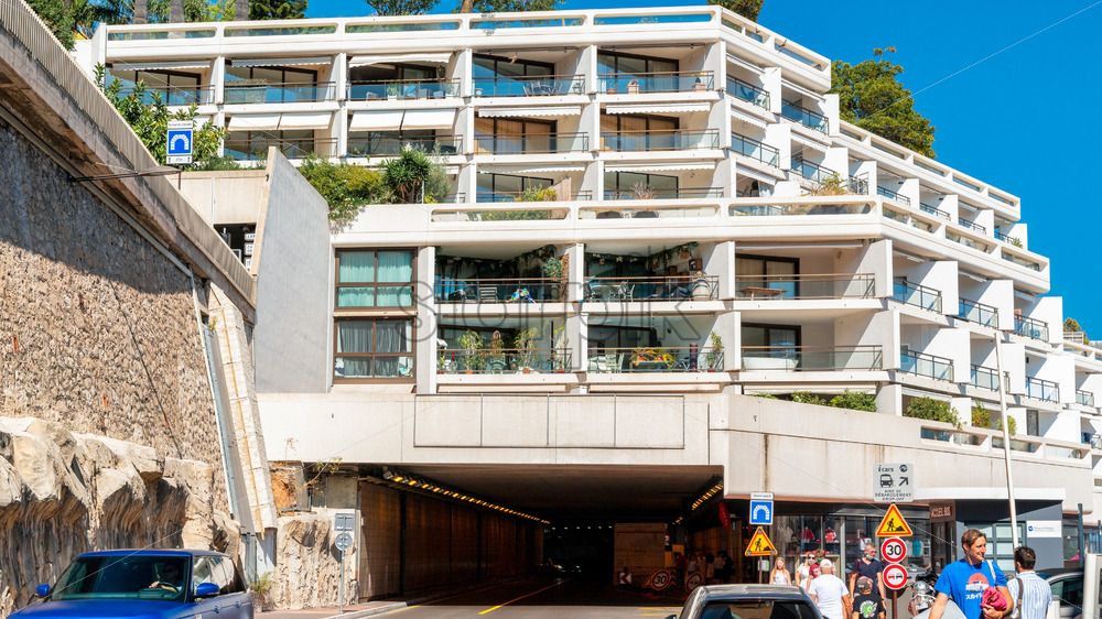 MONACO – 21 AUGUST, 2021: Cityscape of the city. Tunnel under the building, walking people and moving cars