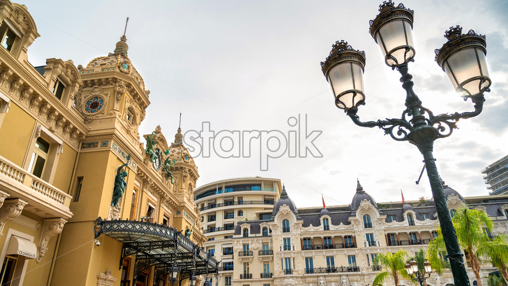 MONACO, FRANCE – JUNE 28, 2017: View from bottom to Monte-Carlo Casino facade with classic ornaments. Bright blue sky with clouds on background.