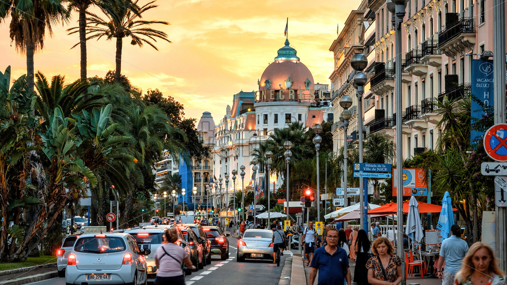 NICE, FRANCE – AUGUST 10, 2021: Street scape of the town at sunset. Traditional buildings, a lot of people, road with cars, greenery and cafes