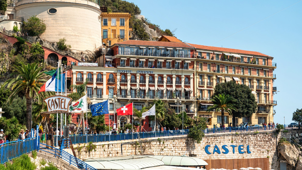 NICE, FRANCE – AUGUST 8, 2021: Street scape of the town. Traditional buildings, greenery, people, sunny day