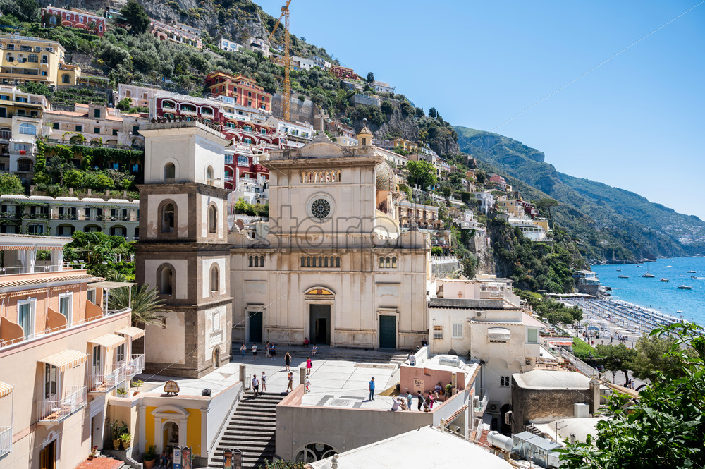POSITANO, ITALY – JUNE, 2022: Street scape of the town located on the Tyrrhenian sea coast. Rows of residential buildings, church with people in front of it, greenery