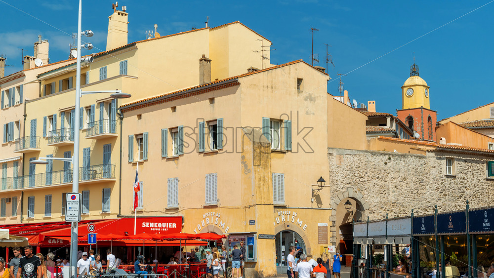 SAINT-TROPEZ, FRANCE – SEPTEMBER 8, 2021: Street scape of the town. Traditional buildings, embankment street with multiple people and cafes