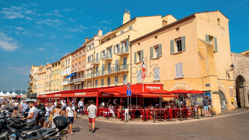 SAINT-TROPEZ, FRANCE – SEPTEMBER 8, 2021: Street scape of the town. Traditional buildings, embankment street with multiple people and cafes