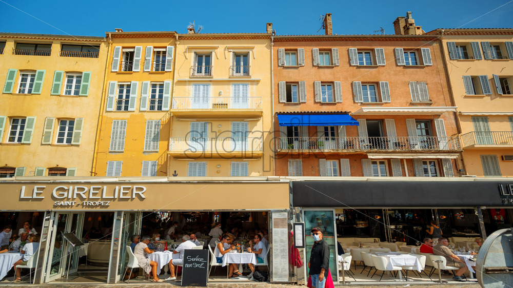 SAINT-TROPEZ, FRANCE – SEPTEMBER 8, 2021: Street scape of the town. Traditional buildings, embankment street with multiple people and cafes