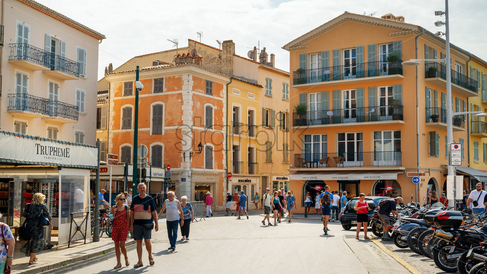 SAINT-TROPEZ, FRANCE – SEPTEMBER 8, 2021: Street scape of the town. Traditional buildings, people, shops