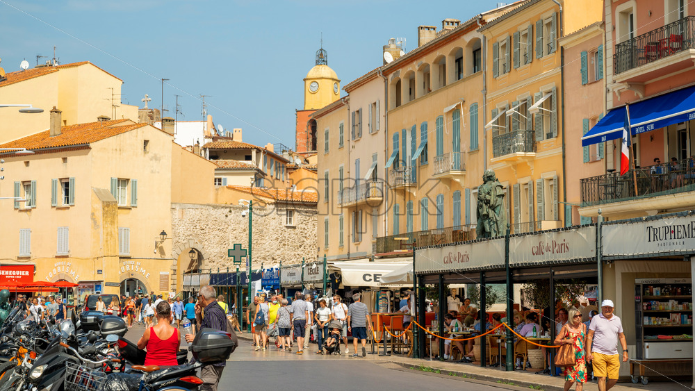 SAINT-TROPEZ, FRANCE – SEPTEMBER 8, 2021: Street scape of the town. Traditional buildings, people, cafes