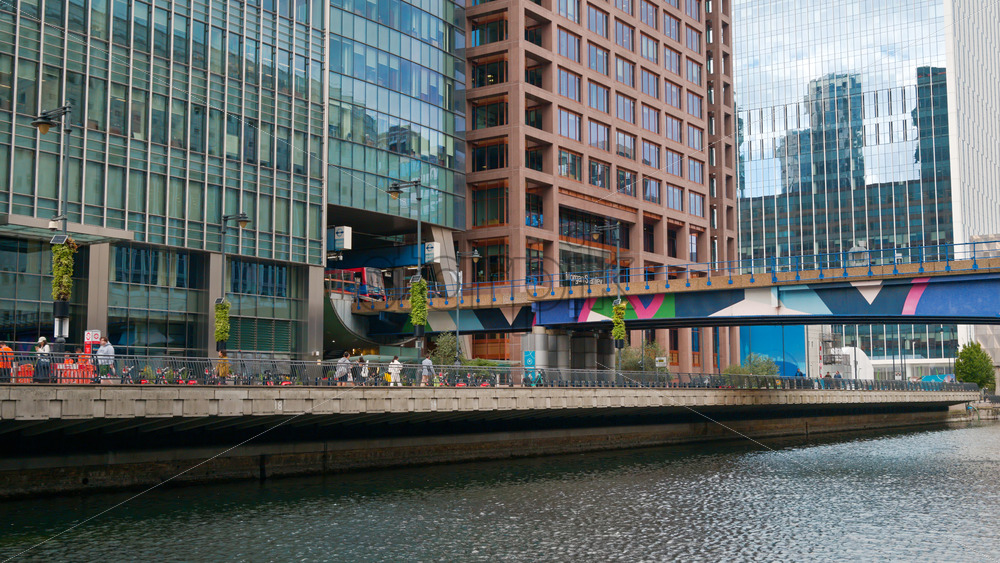 Street scape of the Canary Wharf district in London, United Kingdom. Walking people, water channels with bridge, skyscrapers around