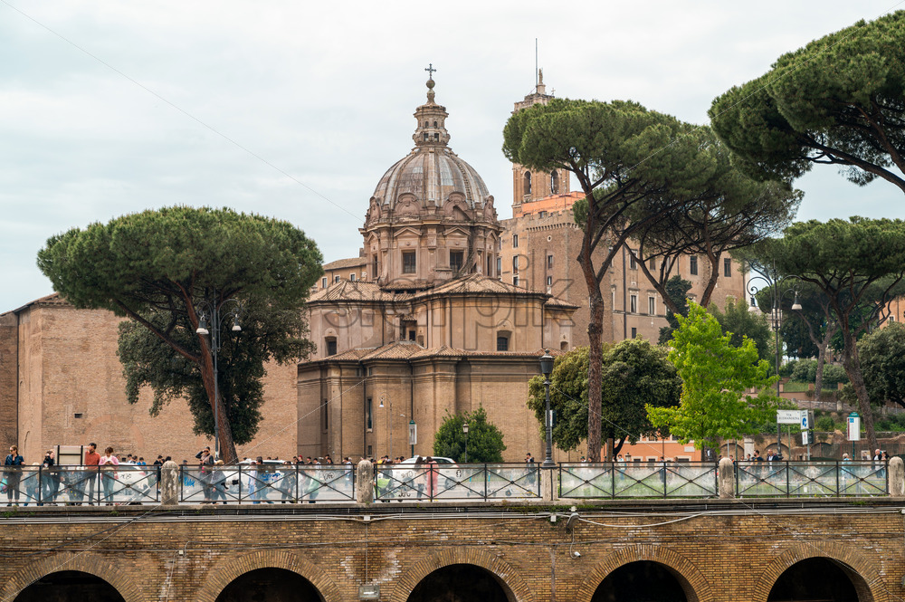 ROME, ITALY – JUNE, 2022: Street scape of the centre of the city. A church, square with multiple people and greenery