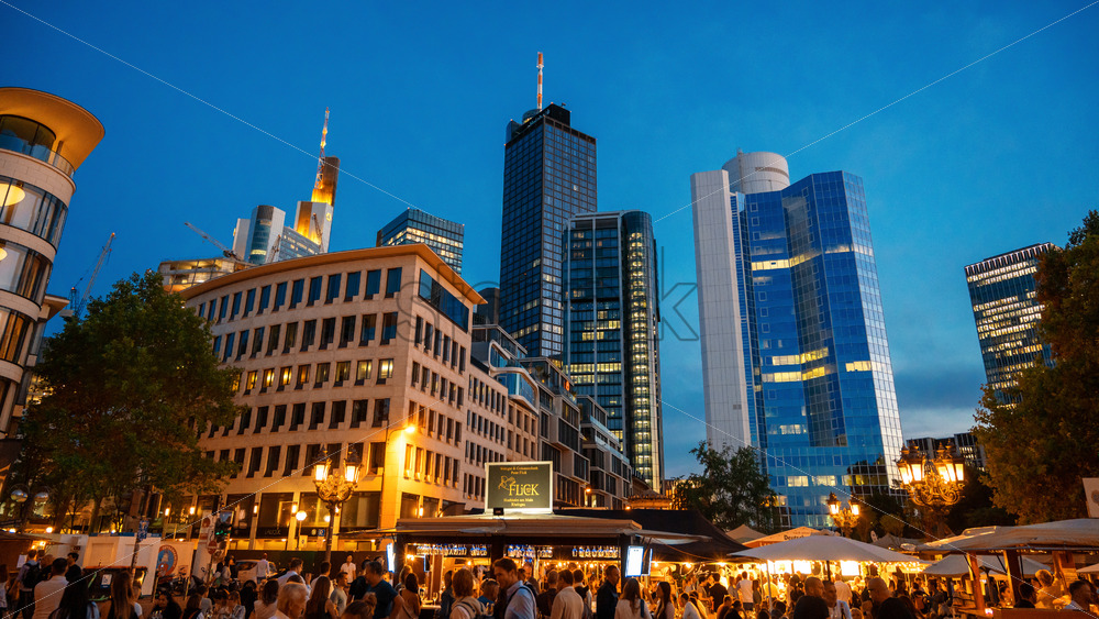 FRANKFURT, GERMANY – SEPTEMBER, 2022: Street view of the city downtown at evening. Square with cafes, resting people and skyscrapers