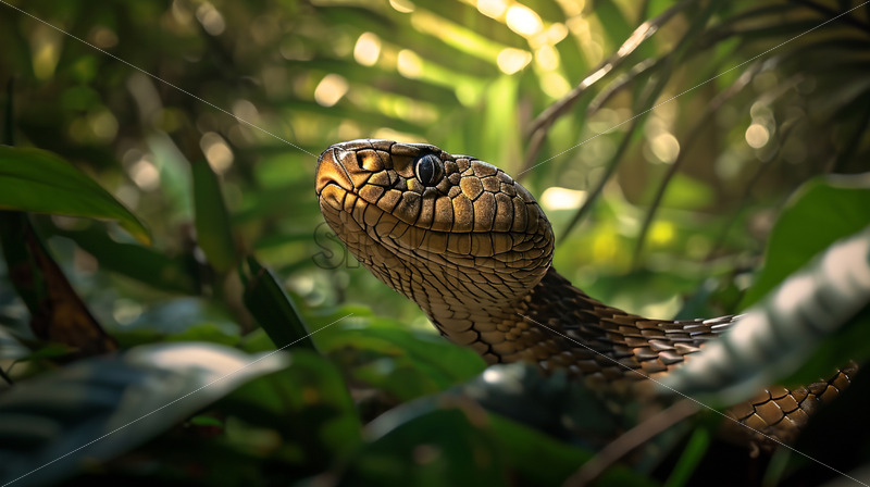 Striking king cobra, poised and ready to strike in the heart of the dense jungle