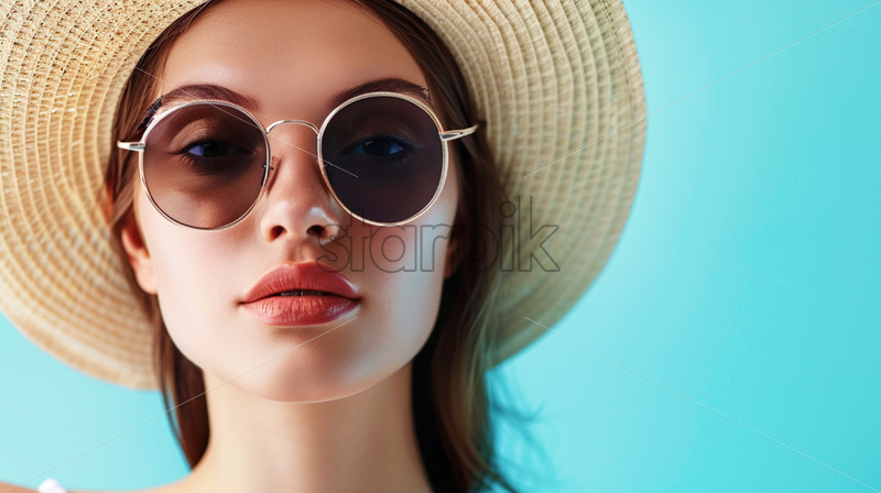 Sale banner with stylish hat, sunglasses and fruits on blue background