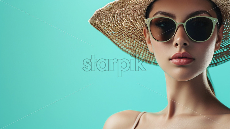 Sale banner with suitcase, sunglasses and palm leaves on pink background