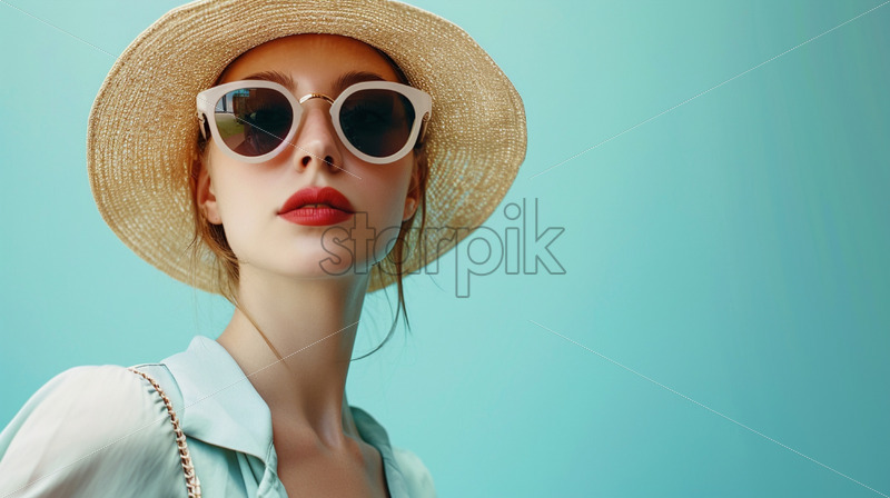 Sale banner with stylish hat, sunglasses and fruits on blue background