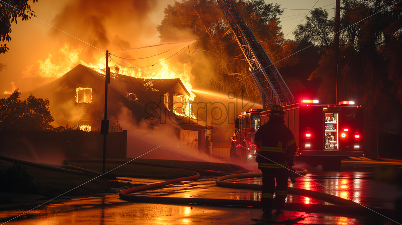 Firefighters in action, tackling a suburban house fire with a firetruck and emergency lights in the background.