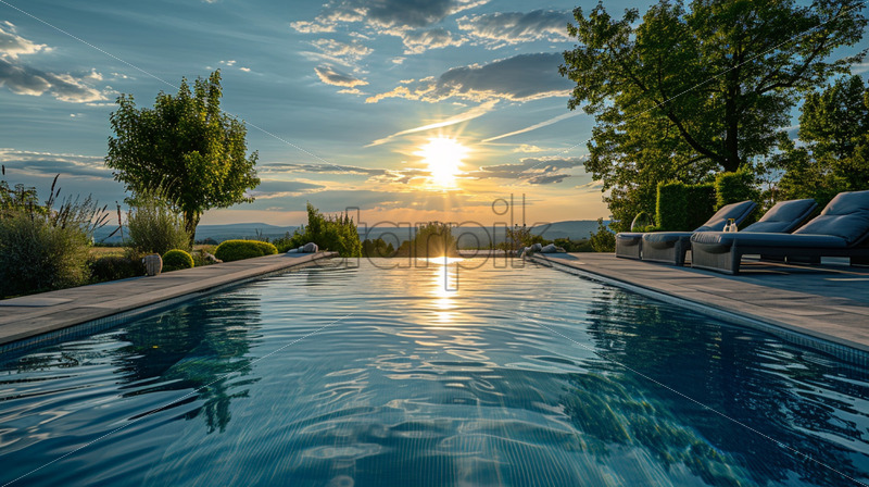 A lively pool party scene with vibrant inflatables, upbeat music, and guests enjoying the sun