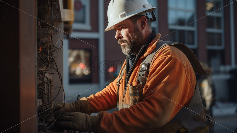 An electrician in PPE contemplates a wire circuit under the morning sun, radiating dedication and expertise while considering solutions.