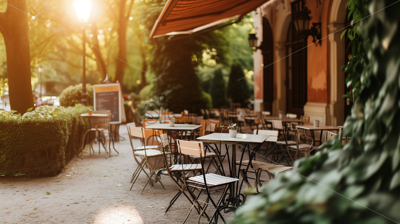 Sunlight filters through tree branches, capturing a park café, warm tones, blending shots, outdoor seating, greenery backdrop.