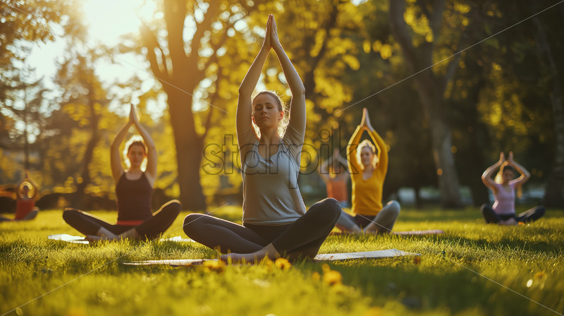A woman leads a morning yoga session with others, hands raised above their heads, as the rising sun filters through tree branches, captured from the front with blurred colleagues in the background.