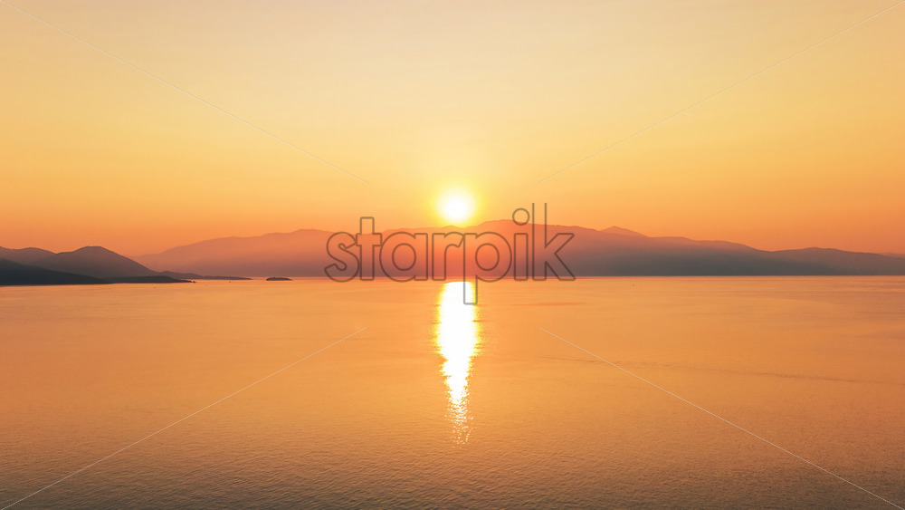 Sunset on the Ionian Sea coast, Greece. Bright Sun, land in the distance, reflections in the water