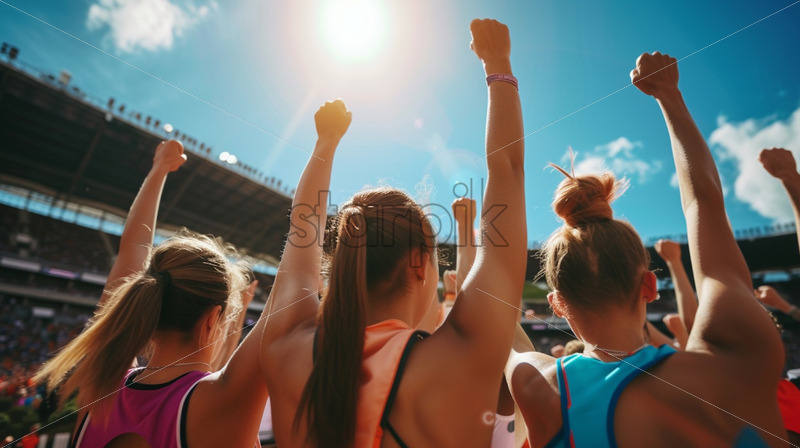Supporters on a stadium with hands up, during the game competitions, winning team