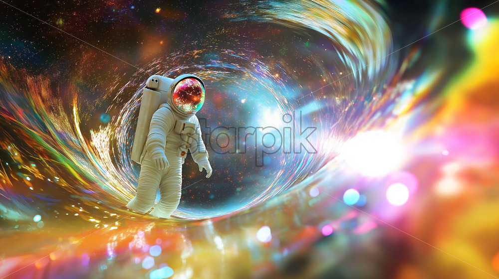 surreal cosmic scene of an astronaut floating near a quantum wormhole
