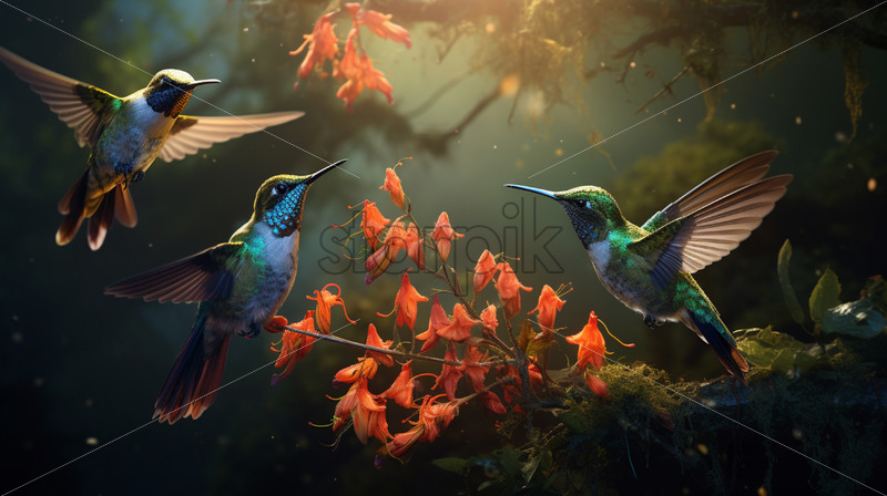 Swarm of hummingbirds feeding on nectar from exotic flowers in a secluded jungle oasis
